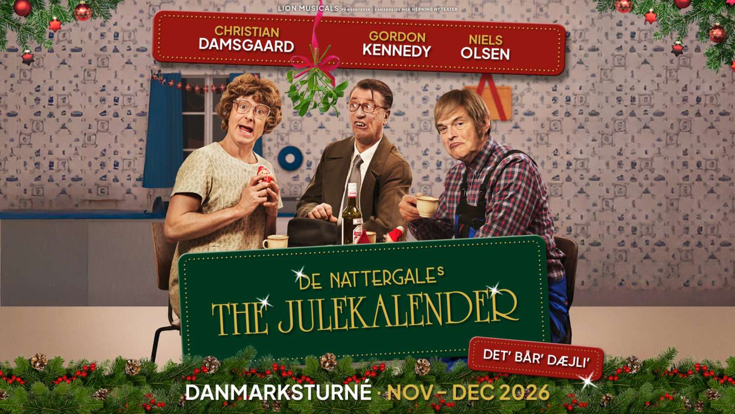 Glæd dig til et gensyn med Gertruds store kasse med julepynt og “æ mistelten”. Skuespillerne Gordon Kennedy, Niels Olsen og Christian Damsgaard indtager scenen som de velkendte karakterer.